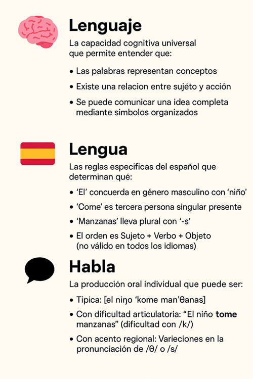 La distinción precisa entre estos conceptos no solo enriquece el marco teórico de los profesionales, sino que también mejora la calidad de las intervenciones educativas y terapéuticas. Esta comprensión resulta especialmente relevante cuando se trabaja con población infanto-juvenil que presenta dificultades en su desarrollo comunicativo (A. T. López, n.d.; J. Á. M. López & García, 2005, pp. 57–63; Trastornos Del Lenguaje: Caracterización Desde Una Perspectiva Lingüística, 2025).